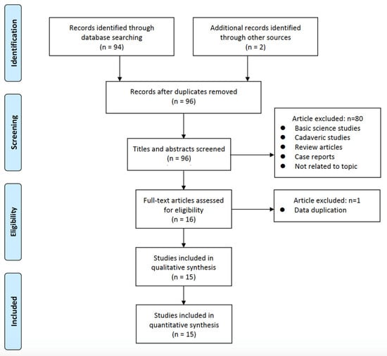 Through the database search, 96 studies were discovered. Following a title and abstract screening, which eliminated 5 irrelevant articles, the remaining 17 possibly relevant articles were obtained. Following a thorough examination of the complete text, 15 articles were finally included in this review [,,,,,,,,,,,,,,]. Figure 1 shows a flowchart for a specific study. Table S1 shows the PRISMA checklist.