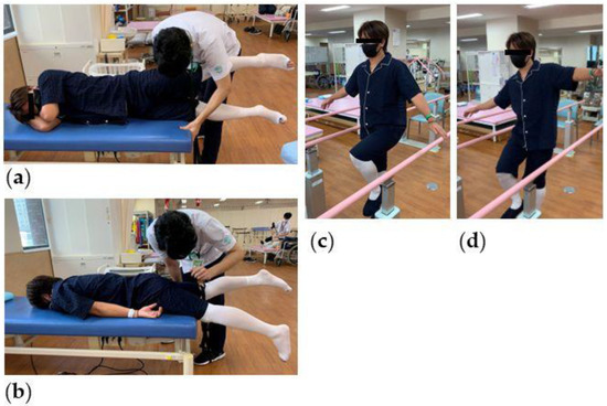 Preoperative physical examination. (a) Measurement of hip abduction strength. (b) Measurement of hip extension strength. In a single-leg standing test, in which the patient had to balance on one leg with his eyes closed, there was good stability on the right leg (c) but not on the left leg (d).
