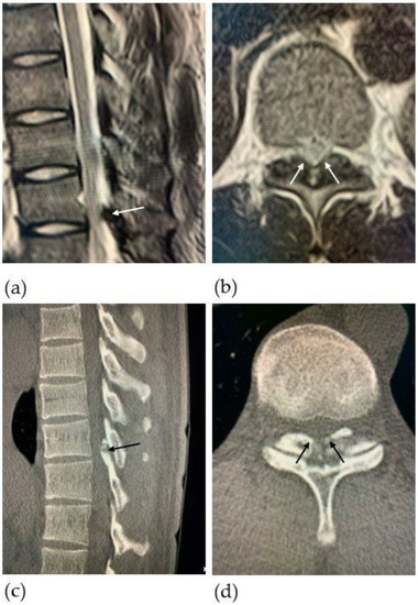 - Yano, T.; Doita, M.; Iguchi, T.; Kurihara, A.; Kasahara, K.; Nishida, K.; Yoshiya, S. Radiculopathy due to ossification of the yellow ligament at the lower lumbar spine. Spine 2003, 28, E401–E404. [Google Scholar] [CrossRef] [PubMed]