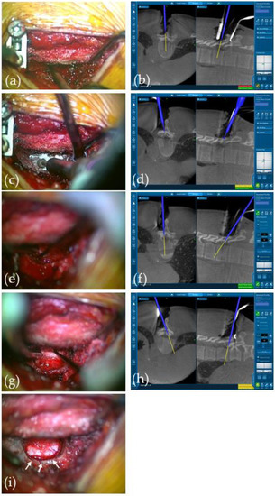 Intraoperative microscope views and O-arm navigation monitor images. Detecting the location of OLF over the T10 lamina using a navigation probe (a,b); the yellow lines in (b) indicate the target direction; drilling the surface of T10 lamina to make the micro-window using the navigation-assisted air drill (c,d); checking the edges of the dura matter on the ipsilateral side (e,f) and the contralateral side (g,h); decompressed dura mater and the spinal cord through the micro-window (white arrows in (i)).