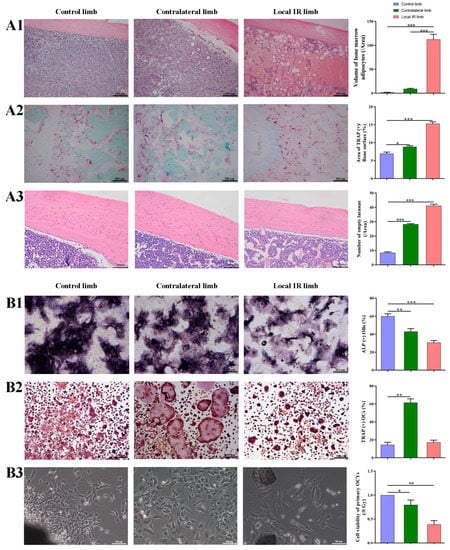IR-induced multicellular dysfunction of bone microenvironment in a mouse model of bone degenerative injury. (A1) The representative images (HE staining) of adipogenic differentiation potential and the quantitative analysis of the volume of BMAs in tissue section. (A2) The representative images of osteoclastogenesis potential and quantitative analysis of TRAP staining of distal femur trabecular bone. (A3) The representative images of biological damage of OCYs and quantitative analysis of empty bone lacuna in femoral bone tissue sections by HE staining. (B1) The representative images of osteogenic differentiation potential and quantitative analysis of ALP staining of BMSCs harvested from the bone marrow. (B2) The representative images of osteoclastogenesis potential and quantitative analysis of TRAP staining of BMMs harvested from the bone marrow of the mice and induced with RANKL stimulation. (B3) The biological damage of OCYs. The morphology of primary OCYs harvested from the experimental mice, and the quantitative analysis of cell viability of primary OCYs by the CCK-8. Data are expressed as mean ± SD (* p < 0.05; ** p < 0.01; *** p < 0.001 vs. control), n = 6. Scale bar, 100 µm. Magnification, ×100. The hind limb of the control group: Control limb; the left hind limb of the local irradiation group: Local IR limb; the right hind limb of the local irradiation group: Contralateral limb. BMAs, bone marrow adipocytes; CCK-8, Cell Counting Kit-8 assay.