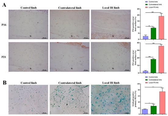 Radiation is an inducer of DNA damage that can, in turn, induce cellular senescence. To assess the senescence-related alterations in cell populations in the bone microenvironment, the expression of the senescence markers, p16INK4a (p16) and p21WAF1/CIP1 (p21), was analyzed via immunohistochemistry of femoral sections 7 days post-radiation. The results demonstrated that the positive expression of p16 and p21 was increased in the cortical bone matrix of irradiated mice compared with the control group (Figure 2A). The enhancement in positive p16 and p21 expression was more notable in the tissues of the locally irradiated hind limb, which demonstrated that ionizing radiation may induce the senescent phenotype of bone tissue cells (p < 0.01; Figure 2A).