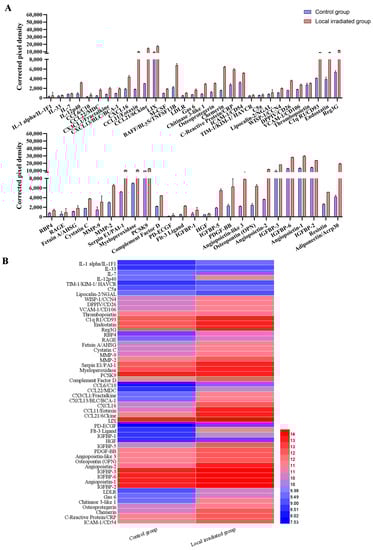 The mouse cytokine antibody chip array detection kit (Mouse Cytokine Array; cat. no. ARY028; R&D Systems, Inc., Minneapolis, MN, USA) was used to detect the changes in protein levels of 111 cytokines and chemokines in the serum of locally irradiated mice. Briefly, 200 μL mouse serum was diluted with the corresponding array buffer. The diluted mouse serum was added to the protein-blocked antibody array membrane and incubated overnight at 4 °C. Next, the membrane was washed three times with the corresponding washing buffer solution, and streptavidin-HRP was incubated with the membrane for 30 min and shaken at room temperature. The membrane was then washed three times with the washing buffer solution, and a chromogenic reagent was added. The signal was detected using a luminescence imager (Chemi Scope 6300, Qinxiang Scientific Instrument Co., Shanghai, China), and the pixel density was quantified with HLImage++ 6.2 computer vision systems (1997, Western Vision Software, Salt Lake City, UT, USA). When the value of corrected pixel density was 2 standard deviations higher or lower than the control group, the index was defined as up- or downregulation.