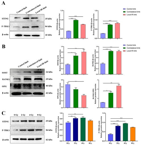 Radiation activates the STING-P-TBK1 pathway and alters the inflammatory secretion. (A) The expression levels of pathway-related proteins STING and P-TBK1 of primary OCYs harvested from the experimental mice by western blot analysis. (B) The expression levels of the bone resorption-related functional proteins SOST, RANKL, and OPG of primary OCYs by western blot analysis. The ratio of RANKL/OPG expression levels of primary OCYs. (C) An in vitro OCY model of irradiation, the expression levels of the pathway-related proteins STING and P-TBK1 3 days post-irradiation by Western blot analysis. Data are expressed as mean ± SD (* p < 0.05; ** p < 0.01; *** p < 0.001 vs. control), n = 3.
