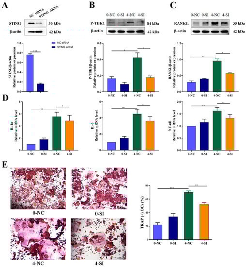 The following reagents were purchased: lipofectamine RNAiMAX (cat. no. 13778100; Thermo Fisher Scientific, Inc., Waltham, MA, USA); opti-MEM (cat. no. 31985062; Gibco, Eggenstein, Germany); STING small interfering RNA (siRNA), negative control (NC)-siRNA (GenePharma Co., Ltd., Shanghai, China); STING small-molecule inhibitor, C-176 (cat. no. HY-112906; Med-ChemExpress, Princeton, NJ, USA); acid phosphatase, leukocyte (tartrate-resistant acid phosphatase; TRAP) Kit (cat. no. 387A-1KT; Sigma-Aldrich, St. Louis, MO, USA); mouse cytokine array (cat. no. ARY028; R&D Systems, Inc., Minneapolis, MN, USA).