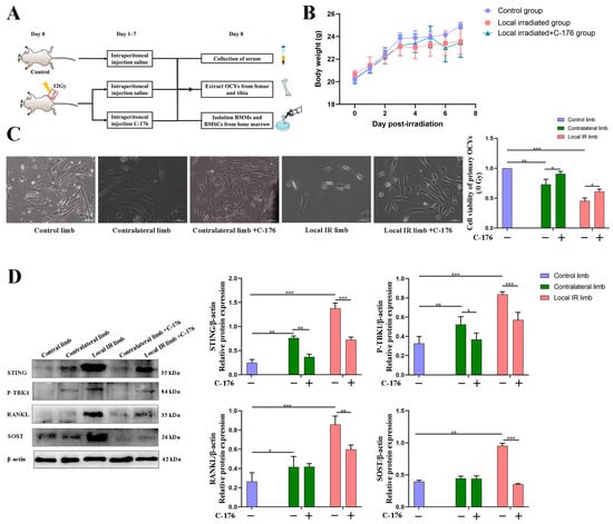 C-176 blocks the STING pathway and ameliorates the excessive inflammatory secretion in a mouse model of bone degeneration. (A) Pattern diagram of the experiment. Control group: no irradiation; local irradiation group: pre-treated with 12 Gy local irradiation; local irradiation group + C-176: pre-treated with 12 Gy local irradiation and given intraperitoneal injections of STING small molecule inhibitor C-176. (B) Effect of 12 Gy local irradiation and C-176 intervention on body weight in mice, n = 12. (C) Changes of morphology and cell viability of primary OCYs harvested from the experimental mice 7 days post-irradiation (scale bar, 100 µm; magnification, ×100. Cell viability of OCYs was quantified using the CCK-8, n = 6. (D) Western blot analysis of the expressions of the pathway-related proteins STING and P-TBK1, and the bone resorption-related proteins SOST and RANKL of primary OCYs, n = 6. Data are expressed as mean ± SD (* p < 0.05; ** p < 0.01; *** p < 0.001 vs. control).