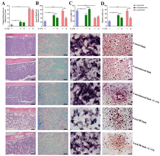 C-176 ameliorates the IR-induced bone turnover imbalance. (A) The quantitative analysis and the representative images (HE staining) of the volume of BMAs in tissue section, showed the intervention of C-176 on the IR-induced active adipogenic differentiation potential. (B) The quantitative analysis and representative images of TRAP staining of distal femur trabecular bone showed the intervention of C-176 on the IR-induced active osteoclastogenesis. (C) The quantitative analysis and representative images of ALP staining of BMSCs harvested from the experimental mice, showed the intervention of C-176 on the IR-induced degenerative osteogenesis. (D) The quantitative analysis and representative images of TRAP+ cells of BMMs harvested from the experimental mice, showed the intervention of C-176 on the IR-induced excessive osteoclastogenesis potential. Data are expressed as mean ± SD (* p < 0.05; ** p < 0.01; *** p < 0.001 vs. control), n = 5. Scale bar, 100 µm. Magnification, ×100.
