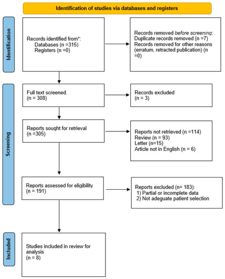 We identified 315 potentially relevant studies through the systematic review of the literature (Figure 1). After removing the duplicates and applying the criteria listed above, an overall number of 191 records screened were potentially relevant to the topic. We excluded all the studies that did not match the inclusion criteria through the records analysis and the following articles’ full-text screening. Thus, the remaining eight papers were included in qualitative synthesis papers for data extraction. After the meta-analysis established the criteria, we considered eight studies for quantitative analysis. The potential risk of bias in observational studies was assessed using the Joanna Briggs Institute Critical Assessment Checklist for Observational Studies (Figure 2).