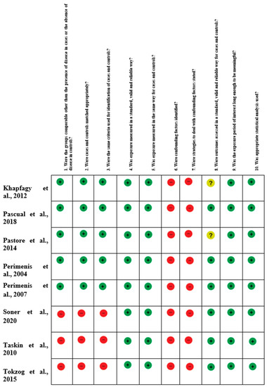 Risk of bias summary [20,21,22,23,24,25,26,27]. The author’s judgments for each included study, assessed by the Joanna Briggs Institute (JBI) Critical Assessment Checklist for Observational Studies.