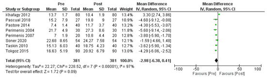 The results were obtained from a total of eight papers, which included three hundred eighty-one patients who received continuous positive airway pressure (CPAP) treatment. These studies assessed erectile function using the International Index of Erectile Function (IIEF) and the Erectile Dysfunction Inventory of Treatment Satisfaction (EDITS) questionnaires. The patients’ apnea–hypopnea indexes (AHIs) were measured both before (AHI > 30 events/h) and after treatment (AHI > 20 events/h). In patients who underwent CPAP therapy, erectile function (EF) scores following treatment were significantly higher compared to the pre-treatment scores (mean: 27.3 vs. 7; p < 0.001). A random-effects model was employed to analyze the results for the three hundred eighty-one patients treated with CPAP across the eight papers. The analysis demonstrated a mean difference (MD) of −2.98 in AHI EF scores (95% confidence interval (CI) −6.38, 0.41). The overall effect Z score for CPAP was 1.72 (p = 0.09), indicating a trend towards improved erectile function following treatment. However, the Q statistic p-value was < 0.001, suggesting statistically significant heterogeneity among the studies, and the I² value was 97%, indicating a high level of inconsistency in the results, as depicted in Figure 3.