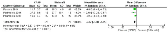 Two papers (120 patients) [23,24] analyzed the ESS outcomes after CPAP treatment, demonstrating a significant reduction from 11.88 ± 1.82 to 6.2 ± 1.48 (p < 0.001).Three papers analyzed the AHI outcomes after CPAP treatment, demonstrating a significant reduction from 32.24 ± 24.96 to 10.67 ± 2.51 (p < 0.01); LOS were reported in three papers, with a significant score improvement from the value of 78.8 ± 7.9 to 89.4 ± 3.9 (p < 0.01) [23,25,26]. At pooled analysis for EF outcomes, both medical treatments demonstrated a higher EF score, but sildenafil reported greater outcomes than CPAP (mean: CPAP 27.3 vs. sildenafil 37.7; (p < 0.01) [20,21,24].