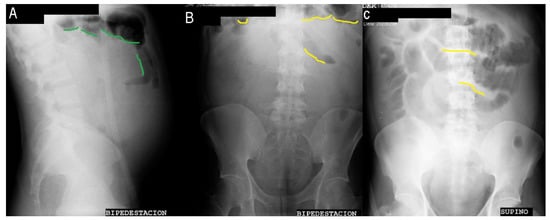 Abdomen series (A) lateral view standing abdominal radiography; (B) frontal view standing abdominal radiography; (C) frontal view X-ray of the abdomen in decubitus supine position with footprint sign. Green color: Pneumatosis intestinalis. Yellow color: Interloop edema.