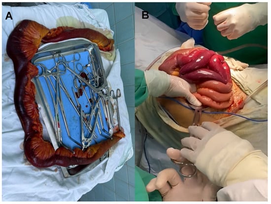 The patient’s symptoms worsened, presenting diffuse and disproportionate abdominal pain and signs of peritoneal irritation. Systemic inflammatory response symptoms developed, and the patient became hypotensive, requiring surgical intervention. Intraoperative findings revealed a 2500 cc intraperitoneal collection and mesenteric ischemia of the jejunum at 80 cm of the Treitz ligament, with approximately 2 m of ischemic loops. The mesentery and intestinal wall were thickened (Figure 3). The intraperitoneal fluid collection was drained and sent for cytology and pathology analysis. Ischemic bowel resection was performed, and damage control measures were implemented. The abdominal cavity was irrigated; a Bogota bag was placed; and the incision was closed. The patient tolerated the procedure, and the prognosis is dependent on the underlying pathology. In general, the prognosis for patients with severe mesenteric ischemic events is guarded, requiring continuous monitoring and treatment to prevent potential relapses and improve long-term outcomes. While other potential diagnoses such as intestinal obstruction with strangulation may be considered, the patient’s history of hemolytic anemia and splenectomy places him at higher risk for mesenteric ischemia.