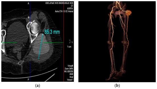 The treatment of symptomatic PSA aneurysms is crucial to prevent potential life-threatening complications, such as rupture and thromboembolism. The choice of treatment approach largely depends on the symptoms exhibited by the patient and the specific form of the PSA []. Complete forms of the PSA typically require previous surgical revascularization of the lower limb, which may involve different bypass methods. On the other hand, aneurysms associated with incomplete forms of the PSA can be treated exclusively using endovascular approaches, which may involve utilization of covered stents, endografts or different embolization techniques []. Exclusion of a PSA aneurysm can be achieved through either open aneurysmorrhaphy or endovascular interventions, commonly involving endovascular embolization or covered stent implantation [,].