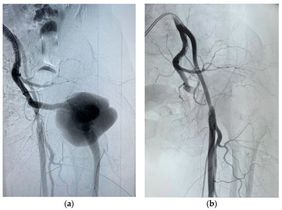 (a) Selective digital subtraction angiography (DSA) of the left persistent sciatic artery, confirming a large pseudoaneurysm (H—head); (b) DSA after the utilization of sandwich embolization technique. Both inflow and outflow of the pseudoaneurysm were embolized using vascular plugs. Flow through the pseudoaneurysm is not observed after embolization.