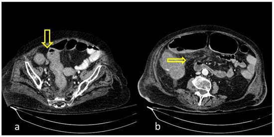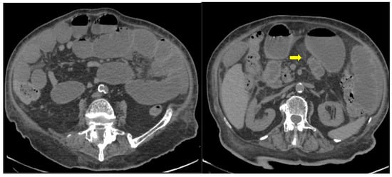 A single-center small retrospective study reported in COVID-19 patients 15 cases of acute aortic thrombosis, splenic artery thrombosis (associated with splenic infraction), superior mesenteric and renal artery thrombosis such as a celiac and an internal iliac thrombosis. An interesting part was a patient with infrarenal aortic wall inflammation and focal dissection, while many venous thromboses have been described (affecting the portal vein, inferior, superior mesenteric, renal, ovarian vein and inferior vena cava). Reports of indirect findings of the splanchnic branch venous occlusion described bowel wall severe edema, hyperenhancement or severe hypoenhancement, associated mesenteric and portal intravenous gas, bowel pneumatosis and pneumoperitoneum (Figure 10) []. Bari Dane et al. published a case of a simultaneous nonocclusive aortic, celiac and superior mesenteric artery thrombus combined with a complete common hepatic artery thrombus [].