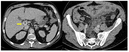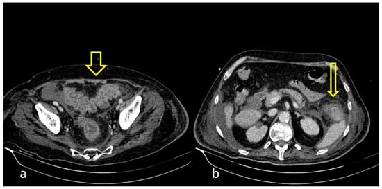 - Hellinger, J.C.; Sirous, R.; Hellinger, R.L.; Krauthamer, A. Abdominal Presentation of COVID-19. Appl. Radiol. 2020, 49, 24–26. Available online: https://appliedradiology.com/articles/abdominal-presentation-of-covid-19 (accessed on 14 May 2023). [CrossRef]