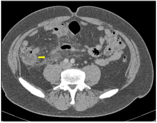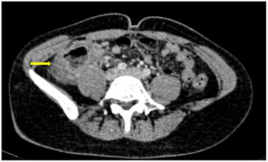 55-year-old male patient with COVID-19 pneumonia with right lower quadrant pain. CT on admission demonstrating a thickened appendix and proximal fat stranding (yellow arrow), indicating acute appendicitis.