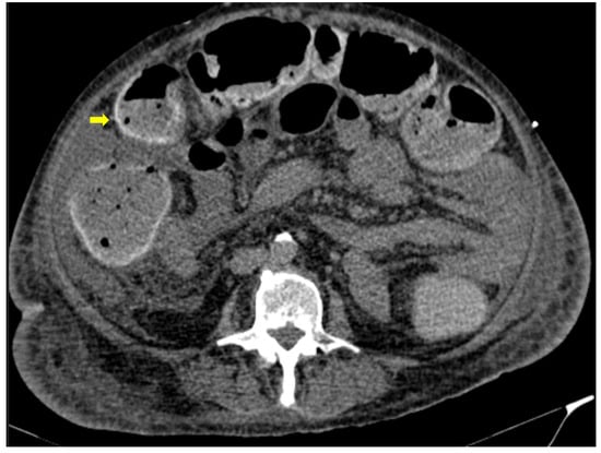 Several studies have investigated the CT findings associated with small intestine involvement. In the CT scans of 149 COVID-19 patients, nearly 20% were indicative of small intestine involvement, with wall thickening, luminal dilatation and mucosal enhancement, especially in severe cases associated with worse outcomes (Figure 5) [].