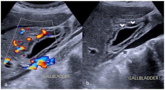 A 69-year-old man with COVID-19 presented a positive Murphy sign. Ultrasound images showed gallbladder wall striation and increased thickness ((b)-arrowheads). The Color Doppler technique revealed hyperemia (a). No gallbladder stones were present indicating acalculous cholecystitis.