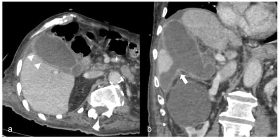A 90-year-old COVID-19 patient presented acute right quadrant abdominal pain and cholestasis. Computed tomography on the axial (a) and coronal (b) plane showed acute cholecystitis with diffuse thickening of the gallbladder wall and pericholecystic fluid (arrowheads). Disruption of the gallbladder wall (arrow) is also present with fluid collection around the liver indicating perforation.