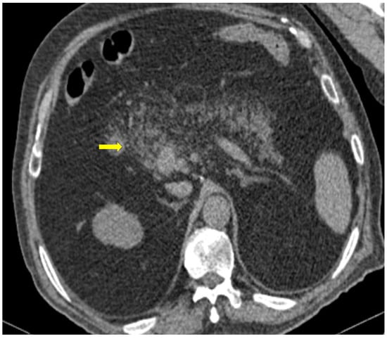 One of the most common imaging findings in CT examinations of COVID-19 patients with hepatobiliary dysfunction (both in the literature and in our series) is hepatomegaly with or without a diffuse decrease in liver/spleen attenuation ratio. This can be due to liver injury due to the virus, pre-existing comorbidities (obesity, nonalcoholic fatty liver, and hepatitis) or as a result of hospitalization (parenteral nutrition and hepatotoxic drugs) [,].