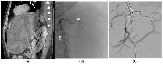 Moreover, the indication for TAE in patients with coagulopathy is another controversial point. Previous reports demonstrated that conservative management could also be effective in patients with coagulopathy and spontaneous hemorrhages [45,46]. Reversal or withdrawal of anticoagulation therapy, correction of acid–base imbalance, volume resuscitation, vasoactive drugs, transfusions, and correction of coagulopathy with fresh frozen plasma and prothrombin complex concentrate are the main conservative interventions described in previous reports [10,32,39,45,46,47]. However, hemodynamic instability, detection of active bleeding on CT-angiography (CTA), and hematoma volume are the main predictors of unsuccessful conservative management; furthermore, failure of conservative management should be previously recognized [10,45,48,49].