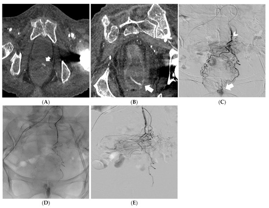 Reformatted CT angiography images in the oblique axial and coronal planes showing a massive rectal hemorrhage (arrows) (A,B). Digital subtraction angiography identifying the superior rectal artery as the feeding vessel (arrowhead); active bleeding is also noted (arrow) (C). Embolization of the superior rectal artery with PVA particles mixed with iodinated contrast media under fluoroscopy control (D). Digital subtraction angiography confirming successful embolization of the feeding vessel (patency of the middle and inferior rectal arteries, fed by the internal iliac arteries, prevented significant ischemic injury of the rectal wall) (E).
