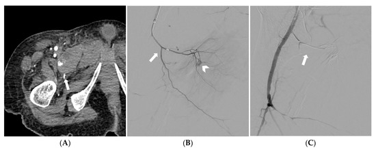 CT angiography depicting a spontaneous rectus sheath hematoma (arrow) (A). Selective catheterization of the right inferior epigastric artery (arrow) with a pseudoaneurysm confirmed at digital subtraction angiography (arrowhead) (B). Digital subtraction angiography showing effective embolization with coil (arrows) embolization starting distal to a small pseudoaneurysm-feeding vessel, thus preventing “backdoor” bleeding (C).