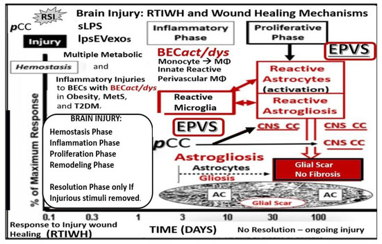Neuroinflammation is the 2nd phase of the RTIWH mechanisms, and if the CNS injurious stimuli are chronic and persistent as in obesity, MetS, and T2DM, the chronic sustained peripheral inflammation with pCC, soluble LPS, and LPS extracellular vesicle exosomes injurious stimuli result in chronic activation of BECs with BECact/dys. This chronic BECact/dys results in chronic neuroinflammation with the generation of chronic CNS cytokines/chemokines [4]. BECact/dys results in neuroinflammation, blood–brain barrier (BBB) disruption, and EPVSs in obesity, insulin resistance, and MetS (Figure 1 and Figure 7) [34]. Importantly, the systemic macrophages and the innate resident perivascular macrophages (rPVMΦs), the innate microglia cells (MGCs), are known to be the first set of effector cells in the RTIWH process, and considered to be the innate immune cells of the CNS [6,49,50].