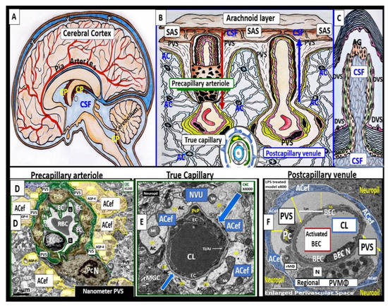 Illustration of the origins of the perivascular spaces (PVSs) and representative transmission electron micrograph (TEM) cross-sections of the precapillary arteriole, true capillary, and postcapillary venule. Panel (A) illustrates the whole brain with its surface pia arteries that dive deeply into the grey matter and deeply into the white matter, terminating in capillaries within the interstitial spaces (ISS). Panel (B) reveals the interaction of the PVSs to precapillary arterioles, which allow the vascular lumen influx of oxygen, nutrients, and solutes (red arrow), in addition to the influx of CSF via the PVSs (red arrow true capillaries with delivery of oxygen, nutrients, solutes, and the postcapillary venules that allow the removal of metabolic waste dioxide plus others), and PVSs that are responsible for the removal of the admixture of ISF and CSF, and metabolic waste (MW) that includes misfolded proteins (amyloid beta and tau neurofibrillary fibrils) (blue arrow) in the subarachnoid space (SAS). Panel (C) depicts how the CSF and its admixed metabolic waste from the PVS glymphatic system is transported to the dural venous sinus (DVS) and the systemic circulation. Panels (D–F) demonstrate representative and corresponding cross-sectional TEMs of corresponding labeled capillary images in Panel (B). Panel (D) demonstrates a precapillary arteriole with a PVS (pseudo-colored green). Panel (E) represents a true capillary without a PVS. Importantly, note that the pia membrane of the glia limitans abruptly ends at the true capillary and that the astrocyte endfeet end directly at the brain endothelial cell basement membrane (blue arrows) (numbers 1–7 indicate astrocyte numbers). Panel (F) depicts a postcapillary venule that appears to have a dilated PVS and is thus considered to be an enlarged PVS (EPVS). Note the presence of a resident perivascular macrophage cell within the EPVS. It is important to note that the PVS provides the conduit structure for the glymphatic draining system to deliver metabolic waste products to the CSF and the systemic circulation for disposal. This adapted and modified image is provided with permission by CC 4.0 [7]. AC = astrocyte; ACef = astrocyte endfeet; ACfp = astrocyte foot process end-feet; AQP4 = aquaporin four; Cl = capillary lumen; CSF = cerebrospinal fluid; EC = brain endothelial cell; ISF = interstitial fluid; N = nucleus; Pc = pericyte; PVS = perivascular space; Mt = mitochondria; RBC = red blood cell; rMΦ = resident reactive macrophage.
