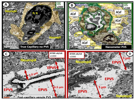 Comparison of normal true capillary and precapillary arterioles to postcapillary venules with enlarged perivascular spaces (EPVSs). Panel (A) demonstrates a true capillary with the astrocyte endfeet (ACef) abutting the shared basement membrane of the brain endothelial cell and pericyte (asterisk and closed arrows) without a pia mater membrane. Panel (B) demonstrates a precapillary arteriole with only a thinned perivascular space (PVS) (pseudo-colored green). Note that the abluminal perivascular space is still ensheathed by the pia matter and basal lamina of the adjacent ACef. Panels (C,D) each depict two different postcapillary venules with enlarged perivascular spaces (EPVS) between 2 and 6.5 μm. Modified image provided with permission by CC 4.0 [7]. Magnification ×1000; ×2000; scale bars = 2 and 1 μm in Panels (C,D) respectively. AC astrocyte; ACef = astrocyte endfeet; AQP 4 = aquaporin 4; Cl = capillary lumen; EC = brain endothelial cell; Pc = pericyte; Pc N = pericyte nucleus; Pcfp = pericyte foot process—endfeet; RBC = red blood cell.