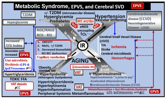Metabolic syndrome (MetS), enlarged perivascular spaces (EPVSs), and cerebral small vessel disease (cSVD). The visceral adipose tissue (VAT), obesity, and hyperlipidemia (atherogenic dyslipidemia) located in the lower left-hand side of the letter X appears to drive the MetS and the other three arms of the letter X, which includes insulin resistance (IR) and the associated hyperinsulinemia, hypertension, vascular stiffening, and hyperglycemia, with or without manifest type 2 diabetes mellitus (T2DM). The global increase in obesity and the accumulation of visceral obesity is thought to be a major driver of the MetS that is related to the excessive metainflammation arising from VAT depots. Follow the prominent closed red arrows emanating from VAT to cerebrocardiovascular disease (CCVD), SVD, TIA, stroke, cerebral microbleeds, and hemorrhages. BEC activation and dysfunction (BECact/dys), with its proinflammatory and prooxidative properties, result in endothelial nitric oxide synthesis (eNOS) uncoupling with increased superoxide (O2•−) and decreased nitric oxide (NO) bioavailability. Importantly, note that obesity, MetS, T2DM, and decreased bioavailable NO interact to result in capillary rarefaction that may allow EPVS development, which are biomarkers for cerebral SVD. Figure adapted with permission by CC 4.0 [7,25]. AGE = advanced glycation end-products; RAGE = receptor for AGE; AGE/RAGE = advanced glycation end-products and its receptor interaction; βcell = pancreatic islet insulin-producing beta cell; FFA = free fatty acids—unsaturated long chain fatty acids; IGT = impaired glucose tolerance; LOAD = late-onset Alzheimer’s disease; ROS = reactive oxygen species; RSI = reactive species interactome; Sk = skeletal: TG Index = triglyceride/glucose index; TIA = transient ischemia attack.