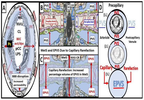 Cross- and longitudinal sections representative of pre- and postcapillary arterioles and venules with an encompassing surrounding perivascular space (PVS). Panel (A) depicts a cross-section of a capillary surrounded by a PVS (solid double red arrows) and its increase in total volume to become an enlarged perivascular space (EPVS) (dashed double red arrows), which represents capillary rarefaction. Panel (B) demonstrates a control longitudinal precapillary arteriole, postcapillary venule, and neurovascular unit (NVU) that runs through an encompassing PVS (light blue). Panel (C) depicts capillary rarefaction (CR) in a longitudinal view, and note how the volume of the PVS increases its total percentage volume once the capillary has undergone rarefaction as in obesity, metabolic syndrome, and type 2 diabetes mellitus. Panel (D) depicts the progression of a normal precapillary arteriole and postcapillary venule PVS to an EPVS once the capillary has undergone rarefaction, allowing for an increase in its total percentage volume of the PVS (1.–3.). Panels (B,C) provided with permission by CC 4.0 [7]. ACef = astrocyte endfeet; AQP4 = aquaporin 4; BEC = brain endothelial cells; BECact/dys = brain endothelial cell activation and dysfunction; CL =capillary lumen; EC = endothelial cell; lpsEVexos = lipopolysaccharide extracellular vesicle exosomes; NVU = neurovascular unit; Pcef = pericyte endfeet.