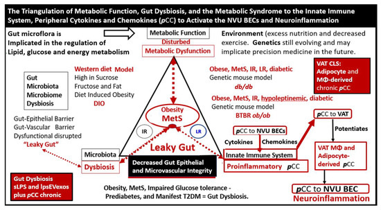 The triangulation of Metabolic function, gut dysbiosis, and the metabolic syndrome (MetS) allows the innate immune system, peripheral, proinflammatory cytokines and chemokines (pCC) to signal the neurovascular unit (NVU) brain endothelial cell(s) (BECs) resulting in BEC activation and dysfunction (BECact/dys) with subsequent neuroinflammation. This schematic demonstrates that gut microbiota dysbiosis, metabolic dysfunction, and an activated proinflammatory innate immune system are associated with obesity and metabolic syndrome (lower-left red box). Importantly, this triangulation also associates with the metainflammation that is produced in the obese visceral adipose tissue depots (upper-right red box). These two distinct sites of metainflammation (red boxes) and dual signaling of BECs will each signal the central nervous system brain endothelial cells to result in neuroinflammation to result in BECact/dys and contribute to enlarged perivascular spaces (EPVSs). Importantly, this dual signaling by the gut and visceral adipose tissue (VAT) of BECs may be synergistic in obesity and the MetS. Image provided with permission by CC 4.0 [34]. Db/db = obese, insulin resistance diabetic genetic mouse model; DIO = diet-induced obesity; BTBRob/ob = black and tan brachyuric ob/ob mouse model of obesity and diabetes; IR = insulin resistance; LR = leptin resistance; sLPS = soluble lipopolysaccharide; lpsEVexos = lipopolysaccharide extracellular vesicle exosomes; MΦ = macrophage; MetS = metabolic syndrome; pCC = peripheral cytokines/chemokines; T2DM = type 2 diabetes mellitus.
