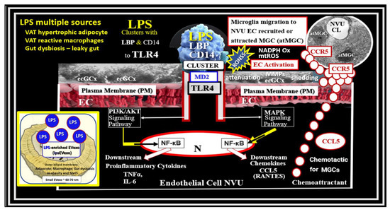 Dual Signaling of BECs by peripheral cytokines/chemokines (pCC) and soluble lipopolysaccharide (sLPS) and LPS-enriched small extracellular vesicle exosome (lpsEVexos), to result in brain endothelial activation and dysfunction (BECact/dys). Note the insert lower-left, which depicts a small EVexo liberating multiple LPS-enriched vesicles and the metabolic signaling of BECs to result in central nervous system cytokines chemokines (cnsCC) and attracted microglia cells (atMGCs) via CCL5 (RANTES). BECact/dys results in neuroinflammation, blood–brain barrier (BBB) disruption, and enlarged perivascular spaces (EPVSs) in obesity, insulin resistance (IR), and the metabolic syndrome (MetS). This modified image is provided with permission by CC4.0 [34]. atMGC = attracted microglia cell; CCL5 = chemokine (C-C motif) ligand 5 (chemoattractant for microglia cells); CD14 = cluster of differentiation 14; CCR5 = C-C chemokine receptor type 5, also known as CD195; CL = capillary lumen; EC = endothelial cell, brain endothelial cells; ecGCx = endothelial glycocalyx; EV = extracellular vesicles; EVMp =EVmicroparticles or microvesicles; EVexo = EVexosomes; IL1-β = interleukin-1 beta; IL-6 = interleukin-6; LPS = lipopolysaccharide; LBP = lipopolysaccharide-binding protein; MAPK = mitogen-activated protein kinase; Mp = microparticles; N = nucleus; PI3K/AKT = phosphatidylinositol 3-kinase/protein kinase B; PM = plasma membrane; RANTES = regulated on activation, normal T cell expressed and secreted; TNFα = tumor necrosis alpha.
