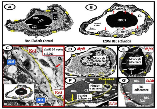 BECact/dys is induced by: (1) proinflammatory cytokines, such as tumor necrosis alpha and interleukin-6; (2) turbulent blood flow, such as occurs at bifurcations and branch points of arteries; (3) advanced glycation end-products, which are elevated in hyperglycemia and aging; and (4) inflammatory stressors such as metainflammation pCC, from VAT depots and plasma membrane peptides of gram-negative bacteria such as soluble LPS and LPS extracellular exosomes from gut microbiota dysbiotic regions. These four functions are each important mediators of ECact/dys via the activation of the nuclear transcription factor of BEC (Figure 8). The following TEM images are examples of BEC activation [25]. BECact/dys is known to be induced by: (i) proinflammatory cytokines, such as tumor necrosis factor alpha and interleukin-6; (ii) turbulent blood flow, such as that which occurs at bifurcations and branch points of arteries; (iii) advanced glycation end-products, which are elevated in hyperglycemia and aging; and (iv) inflammatory stressors such as metainflammation and plasma membrane peptides of gram-negative bacteria such as soluble LPS and LPS extracellular vesicle exosomes. These four functions are each important mediators of BECact/dys via the signaling of the BEC nuclear transcription factor. The following TEM images are examples of BECact/dys (Figure 9) [7,25,34,46].