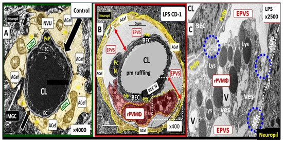 Enlarged Perivascular Spaces (EPVSs), reactive perivascular macrophages (rPVMΦs), and crosstalk with pericytes and foot processes (Pcfps) and PVS astrocyte endfeet (ACef). Panel (A) demonstrates a normal true capillary in a 20-week-old female C57B6/J control model and note how the ACef are arranged tightly about the shared basement membrane of the brain endothelial cell (BEC) and pericyte (black and white arrows). Panel (B) depicts an EPVS with an aberrant polarized rPVMΦ in a 20-week-old lipopolysaccharide (LPS)-treated male model and note how the ACef are markedly separated from the capillary (red double arrows). Also, note the white dashed-box bounds the area in Panel (C). Panel (C) depicts the communication crosstalk via rPVMΦs contacting the Pcfps and the EPVS abluminal lining ACfps (blue dashed-circles and white dashed-lines). Modified images provided by CC 4.0 [34]. AQP4 = aquaporin 4; Lys = lysosomes; Mt = mitochondria; N = nucleus; NVU = neurovascular unit; V = vacuoles; ves = vesicles. black/white arrows in subfigure (A) note how the ACef are arranged tightly about the shared basement membrane of the brain endothelial cell (BEC) and pericyte (black and white arrows). In Subfigure (B) white dashed boxed bounds the area in Panel (C) and the EPVS abluminal lining ACfps (blue dashed-circles and white dashed-lines.
