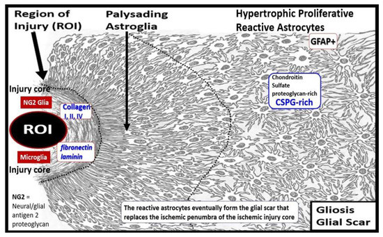 Brain injury results in reactive ACs (rACs) that are essential for early tissue protection. They are the second effector cell in the RTIWH process in the brain and are responsible for the proliferative phase and astrogliosis in the brain. Since the brain does not have fibrocytes/fibroblasts in the neuronal parenchyma, as occurs in non-neuronal tissues, there is no fibrosis within the parenchyma, but instead the rACs are responsible for forming gliosis and the glial scar [6]. Importantly, rACs instigate the cellular proliferative phase in brain injury, since neuronal cellular repair is impossible because CNS neurons are incapable of regeneration [6]. Thus, the proliferative phase occurs in the immediate areas surrounding regions of brain injury, and become reactive and undergo proliferation and hypertrophy, which is termed astrogliosis or gliosis, which is responsible for astrogliosis or glial scar formation to protect the normal surrounding neuronal tissues [6,7,34,61,62,63,64,65]. Further, the glial scar is known to replace the ischemic penumbra that originally surrounds the ischemic injury core (Figure 12) [63].