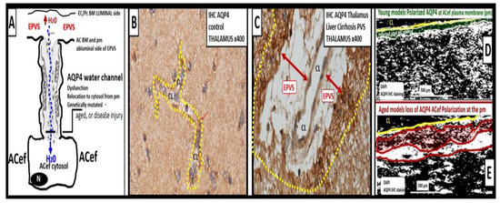 Representative illustrations of water channel aquaporin 4 (AQP4), and representative immunohistochemistry (IHC) staining of thalamus AQP4 in models. Panel (A) demonstrates an illustration of the AQP4 water channel localized to the astrocyte endfeet (ACef) at the plasma membrane that extends to the enlarged perivascular spaces (EPVS). Panel (B) illustrates an elongated capillary in the region of the thalamus in a control model and note the mild staining of the AQP4 via IHC staining with the AQP4 antibody (surrounded by dashed-yellow line). Panel (C) depicts marked heavily stained AQP4 water channels with IHC AQP4 antibody staining in a model with acetaminophen-induced liver failure and hepatic encephalopathy (surrounded by yellow-dashed line). AQP4 is known to be upregulated in aging and in ammonia-induced brain injury; however, it becomes maldistributed and there is a loss of plasma membrane (pm) polarity associated with its maldistribution and dysfunction. Panel (D) is a representative illustration of the AQP4 water channel that is polarized to the ACef pm (pseudo-colored green outlined by yellow line) that undergoes a loss of ACef polarization to become maldistributed in the cytosol of ACef in Panel (E). Panel (E) depicts the maldistribution of AQP4 IHC staining (pseudo-colored red outlined by yellow line) and note the increased condensation as compared to the more flocculent IHC staining Panel (D). Representative illustrations in Panels (A,D,E) were created in Microsoft 3-D paint program. Modified in Panel (A) image reproduced with permission by CC 4.0 [34]. Note the insertion at end of Panels (B,C) (surrounded by dashed-yellow line). Also note in Panel (D) (pseudo-colored green outlined by yellow line) Panel (E) (pseudo-colored red outlined by yellow line) BM = basement membrane; CL = capillary lumen; DAPI = 4′,6-diamidino-2-phenylindole fluorescent stain; EC/Pc = endothelial cell/pericyte; H2O = water; pm = plasma membrane.
