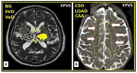 Magnetic resonance imaging (MRI) comparisons of basal ganglia (BG) enlarged perivascular spaces (EPVSs) to centrum semiovale (CSO) EPVSs. Panel (A) depicts the paired EPVSs within the BG that are traced in open on the left and masked yellow on the right BG. Note the white spaces within the paired dashed lines just above the paired BG structures. MRI image from a 75 y/o male status post-stroke, recovered with small vessel disease. Panel (B) depicts the paired elongated oval structures outlined by yellow dashed lines to enclose multiple white enlarged perivascular spaces. Note the open white arrows outlined in red pointing to prominent EPVSs. MRI image from a 79 y/o female with history of transient ischemic attacks. Importantly, note that BG EPVSs are strongly associated with cerebral small vessel disease (SVD) in Panel (A) and that CSO EPVSs are strongly associated with late-onset Alzheimer’s disease and cerebral amyloid angiopathy (CAA) in Panel (B).