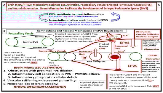 Brain injury and the response to injury wound healing (RTIWH) facilitates brain endothelial cell (BEC) activation, neuroinflammation, and enlarged perivascular spaces (EPVSs). Panel (A) illustrates the bidirectional relationship between perivascular spaces (PVSs) and neuroinflammation in relation to EPVSs. Panel (B) demonstrates the contribution and mechanisms to the development of EPVSs. The brain is exposed to many injurious stimuli over time and in multiple diseases and syndromes such as obesity, metabolic syndrome, and type 2 diabetes mellitus. These injurious stimuli result in BEC activation and dysfunction (BECact/dys), which acts as a pivotal point in the RTIWH and these mechanisms also contribute to multiple wound-healing phases (hemostasis, inflammation–neuroinflammation, proliferation, remodeling, and resolution, only if the injurious stimuli are damped down or removed). Since these injurious stimuli are chronic, the brain remains under the constant influence of the wound-healing phases and chronic remodeling of essential brain structures and the development of EPVSs. Herein we propose a sequence of events in the development of EPVSs as follows: Brain injury, BECact/dys, neuroinflammation with RTIWH, obstruction of PVSs due to accumulation of inflammatory cell leukocytes within and around the neurovascular unit and postcapillary venular PVS and inflammatory-derived cellular debris, vascular stiffening with deceased pulsatility, and neuronal degeneration with neuronal loss and brain atrophy.