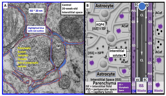 Transmission electron microscopic image of interstitial spaces (ISS) and illustration of interstitial fluid flow to the glymphatic system. Interstitial spaces (ISS) are nanometer structures; however, they combine to create a total of 20 percent of total brain volume and empty their interstitial fluid contents and metabolic wastes into the perivascular conduit spaces of the glymphatic space, or system (GS) to be delivered to the cerebrospinal fluid (CSF). Panel (A) demonstrates the nanosized diameter of ISS containing the ISS in a control 20-week-old mouse model from the frontal cortical grey matter. Panel (B) depicts how the ISS containing the ISF, solutes (black dots), and metabolic waste empties into the post-capillary venule perivascular space (PVS) or the conduit of the GS, which is responsible for toxic waste clearance. AC = astrocyte; ACef = astrocyte endfeet; EC = endothelial cell; CL = capillary lumen.