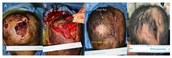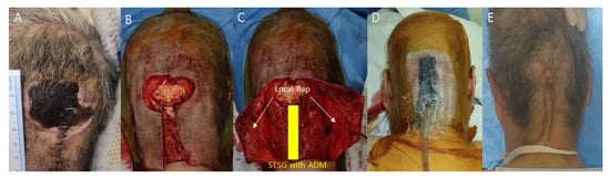At first, debridement was done. Necrotic tissue was removed until viable tissue appeared. The endpoint of debridement was the presence of fresh bleeding from the surface. After debridement using Metzenbaum scissors and a Bovie, a local transposition flap was meticulously elevated through dissection of the subgaleal plane. The local flap was a galeocutaneous flap, which is composed of skin, subcutaneous tissue, and galea. The periosteum remained in its original position. The flap design was performed using a random pattern, and the precise locations of key vessels, such as the occipital artery and superficial temporal artery, were not assessed prior to flap elevation. Repositioning of the flap was accomplished through either rotation or advancement, with the specific method and pivot angle varying from case to case. However, based on extensive surgical experience with the scalp, great care was taken to avoid excessive pivot angles and tension. The flap was meticulously inset to cover the exposed bone, securing it in place through suturing with adjacent viable scalp and periosteum at the original flap site. After the local flap transposition, the split thickness skin graft (thickness: 0.2 mm) was harvested from the posterolateral thigh. For a better aesthetic and functional outcome, Acellular dermal matrix (Alloderm, LifeCell Corp, Branchburg, NJ, USA) was used. Acellular dermal matrix and harvested split thickness skin were covered on the periosteum of the donor site of the galeocutaneous transposed flap. After all the procedures including flap inset and skin graft were performed, black NPWT sponge (V.A.C. Granufoam, KCI, now part of 3 M company, San Antonio, TX, USA) was then placed above wound margin of transposed local flap and grafted skin. The device (INFOV.A.C. Therapy Unit, KCI, now part of 3 M company, San Antonio, TX, USA) was set to −125 mmHg on continuous mode. NPWT apparatuses were removed after 7 postoperative days.