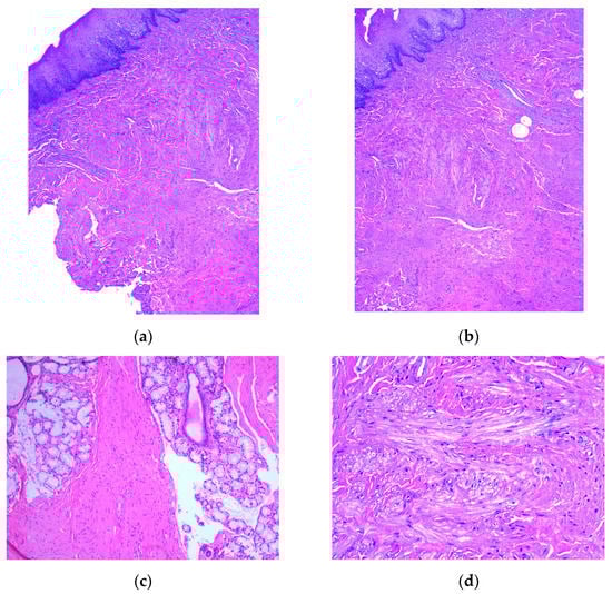 Microscopic aspects of HE-stained slides: (a) tumor proliferation in the oral mucosa with spindle-shaped cells arranged in different-sized fascicles, ob. 5x; (b) different-sized spindle cell fascicles disposed in the lamina propria of the oral mucosa, ob. 5x; (c) fascicles of tumor cells arranged among acinar structures in the lamina propria of the mucosa, ob. 5x; (d) fusiform tumor cells in a fasciculate pattern, with large, eosinophilic cytoplasm and elongated monotonous blunt-ended nuclei, ob. 20x.