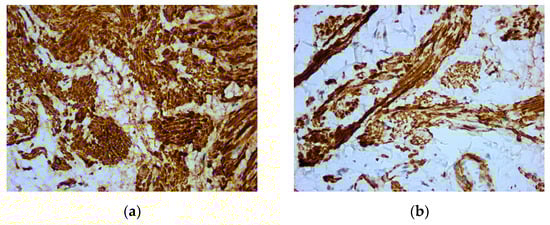 Microscopic images of IHC reactions for desmin, ob. 40x: (a) tumor cells with diffuse and intense positive reaction for desmin; (b) intense and diffuse cytoplasmic positive reaction in all the tumor cells.