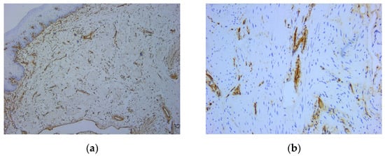 - Gueiros, L.A.; Romañach, M.J.; Pires-Soubhia, A.M.; Pires, F.R.; Paes-de-Almeida, O.; Vargas, P.A. Angioleiomyoma affecting the lips: Report of 3 cases and review of the literature. Med. Oral. Patol. Oral. Cir. Bucal 2011, 16, 482–487. [Google Scholar] [CrossRef] [PubMed]