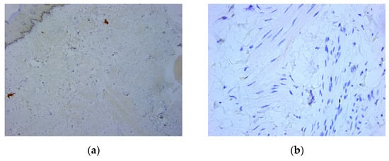 Microscopic images of IHC reactions for Ki67: (a) positive reaction in the nuclei of basal layer cells of the covering epithelium, ob. 5x; (b) only a few positive nuclei of the tumor cells, ob. 40x.