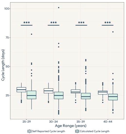 Self-reported and calculated cycle lengths across age groups. Across all age groups, calculated cycle lengths tended to be shorter than self-reported cycle lengths, with a significance level of *** p < 0.001.