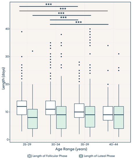 Furthermore, other studies have observed the opposite trend in age group data and cycle phase length [,]. While this study demonstrates that both the follicular and luteal phases become shorter with age, other studies have reported that the luteal phase stays constant over the lifespan [,,].